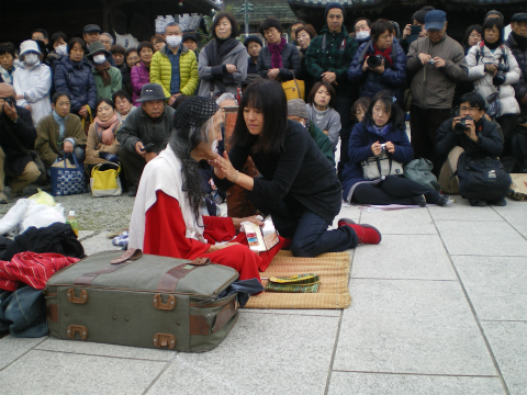 開演10分前に世話人さんからご挨拶があった頃には、すでに人垣は3重4重になっていた。そして、公演スペース真横にあるお稲荷さんのあたりまで、人垣が伸びているのには驚いた。後から奥さんが言うことには、「後ろの人垣のおかげでだんだん暖かくなってきた」というくらいで、すでに目の子で200人は超えていたと思う。