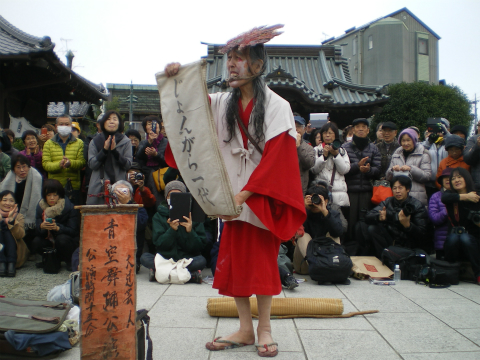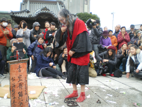 その後、本堂から90°横に位置しているお稲荷さんのところまでダッシュ、両手を上げてアピールした。観客はもちろん拍手喝采である。観客はいつもの川越公演よりもかなり多く、師匠を囲む人垣はお稲荷さんのところまで伸びている。普通にお参りの人が来ていたら、本堂まで行くのにずっと大回りしなくてはたどり着かない。ギリヤーク師の貸切り状態である。