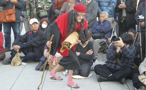 定時の2時を2、3分回ってから、スターバックス方向からギリヤーク師が登場した。まさかスタバにいた訳でもあるまいが、ちょっとうれしそうに見える。例によってカートにトランクとカセットレコーダー、スピーカーを乗せ、茣蓙などの入った包みを抱えて現れた。足下を見ると、革靴が新しい。新調したのだろうか。