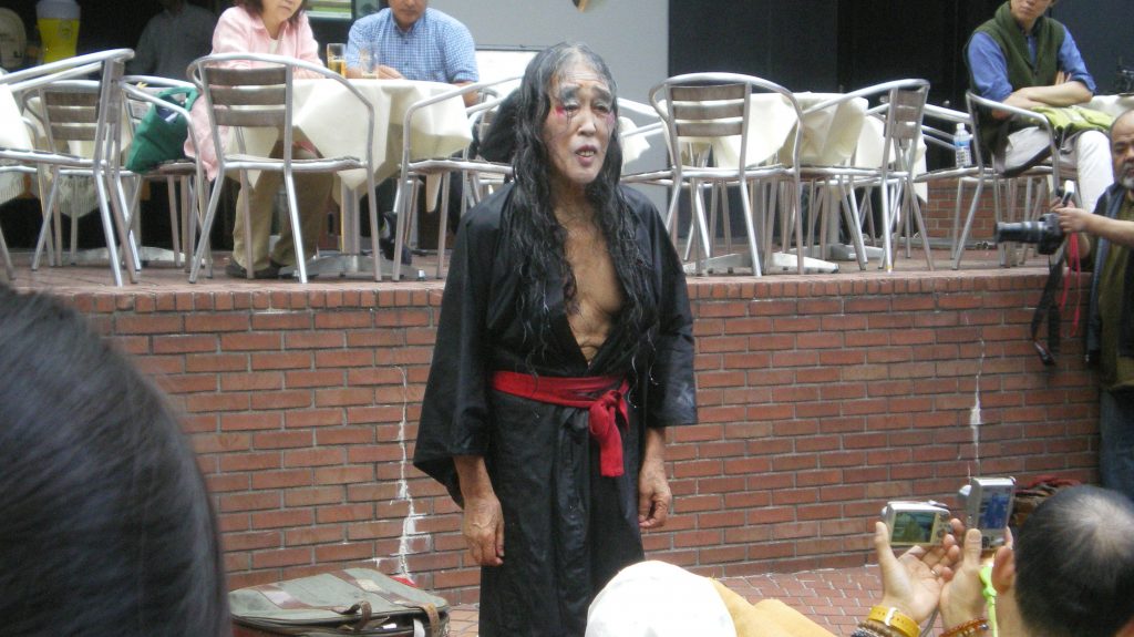 ギリヤーク尼ヶ崎、御年83歳。最後の大道芸人とも呼ばれるパフォーマーである。四季に定期公演があり、春には関西、夏には北海道、秋にこちら新宿、冬には川越に登場する。今年の夏は二十年以上続けて来た北海道公演をヒザの古傷が悪化したため中止している。今回の新宿公演も開催が危ぶまれたが見事に再起、こうしてわれわれの前に姿を現した。