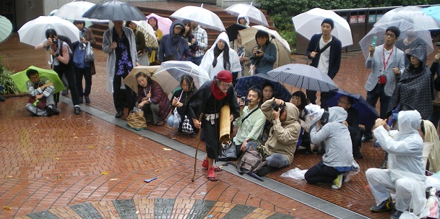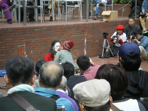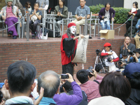 私のつたない体験上、これほどの観客が集まったことはなかった。さすがに本場の新宿である。ざっと数えただけで200人以上、公演中は300人近く集まったのではないだろうか。仕方なく、立ち見の二列目に場所を取る。前に六列くらいある。横浜六角橋も込み合ったけれどあれは場所自体が狭い。なにしろ今回は三井ビル55広場なのである。