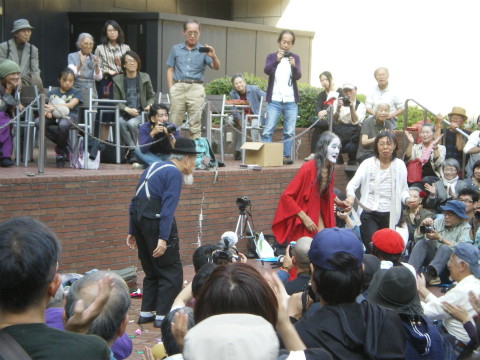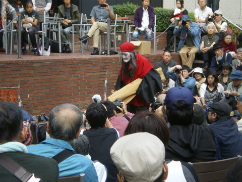 このおじさん、ファンブログを見ると黒田オサムさんという、やはり大道芸の人なのだそうだ。そしてWEB情報によれば、このオサムさんは1931年生まれというからギリヤーク師と一つしか違わない。オーバー80の大道芸人なのであった。あごヒゲは真っ白だが、動きは軽い。さすがに長年大道芸で鍛えてきただけのことはある。