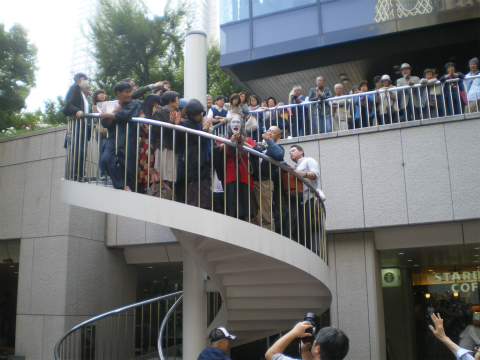 この日の階段は踊り場までで、上の歩道までは無理でした。それにしても、階段の上までこの人垣。