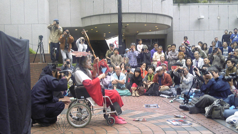 そして、どこで支度をしていたのか、すでにじょんがら一代の衣装に着替え、化粧もすませたギリヤーク尼ヶ崎師匠が、車椅子に乗って人だかりの後ろまでやって来た。車椅子を押すのは、黒子姿のキノさんである。