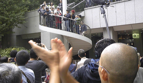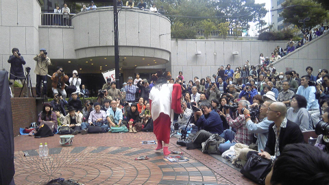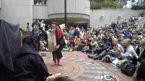 さて、三井ビル55広場に着いた。30分前だというに、もう100人以上集まっていて、椅子は3重くらいに並べられている。それは昨年と同じなのだが、何だかいろいろと様子が違う。いつもは無造作に投げられているギリヤーク師の公演写真がガムテープで壁や地面に貼られ、パンフレットも重しを付けて置かれている。