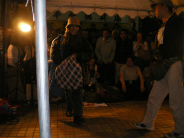 前のヒップホップショーが押して、会場の準備ができたのは9時を少し回ってからであった。商店街の方がゴザを用意してくれたので靴を脱いで座ったのだが、下が堅いのとスペースが狭いので姿勢を安定させるのにひと苦労である。正座をすればスペース的に問題はないのだが、すぐに足が痺れてしまうのである。