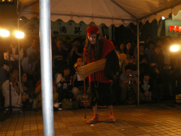 後からギリヤーク師は、「さっきは踊りながら息ができなくなっちゃって。こんなことは初めて」と言っていた。路面も堅いし、夜も遅い。私だって足が痛むのだから、師匠はもっと痛いだろう。調子が悪いのに夜の公演はどうなのかなあ、と思う。大道芸一筋の師匠は、そんな同情はされたくないだろうけれど。