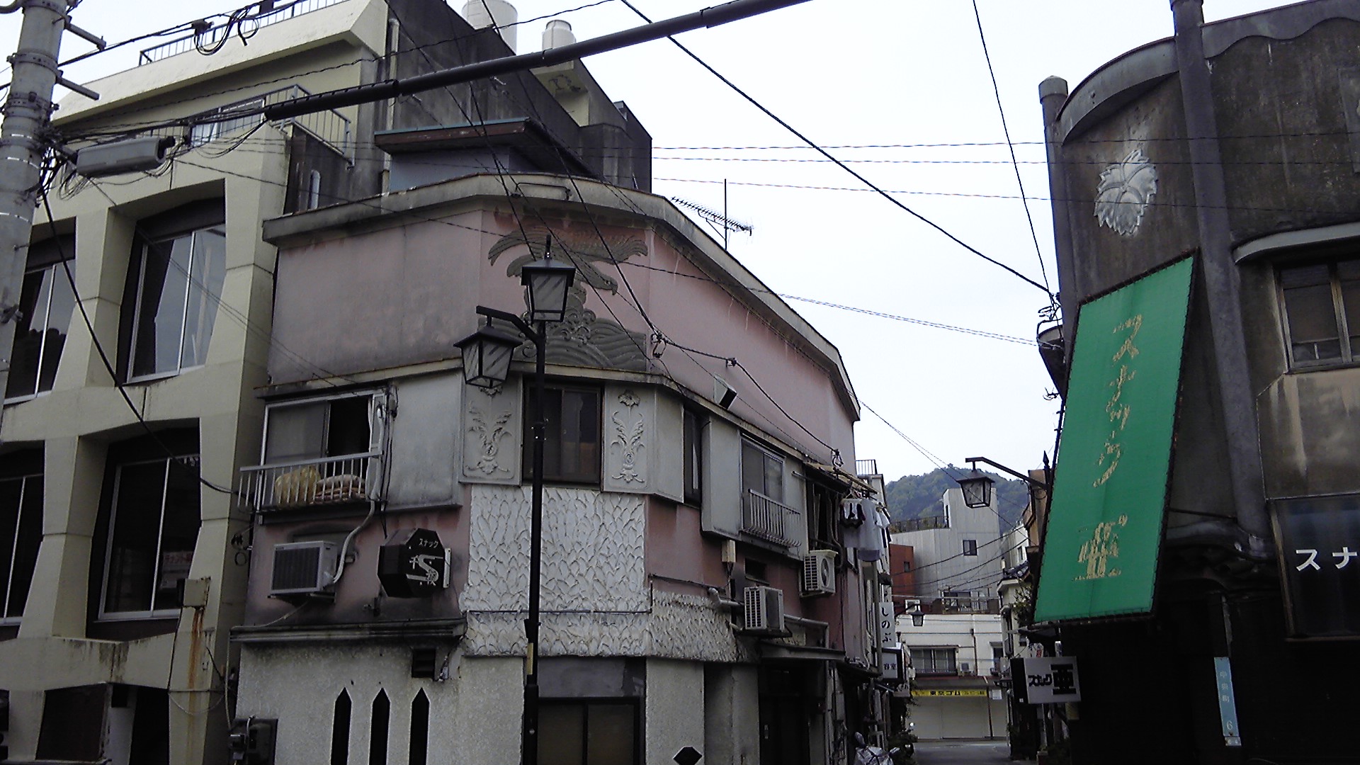 右のスナック亜(つたや跡)の家紋や、左ピンクの建物のレリーフも、当時のものということです。