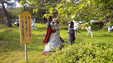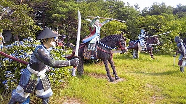 などと、はるか戦国の世に思いをはせるが、膝ががくがくするのはいかがなものだろう。なにしろ、もともと出張なので足元は革靴なのだ。入場料の700円を払って、ウォーランド園内へ。ざっと10人ほどの先客がいたのは、かえって意外。彫像の周囲は腰くらいの高さまで雑草が生い茂り、ちょうど草刈りの最中。かえって戦場らしい雰囲気ではある。