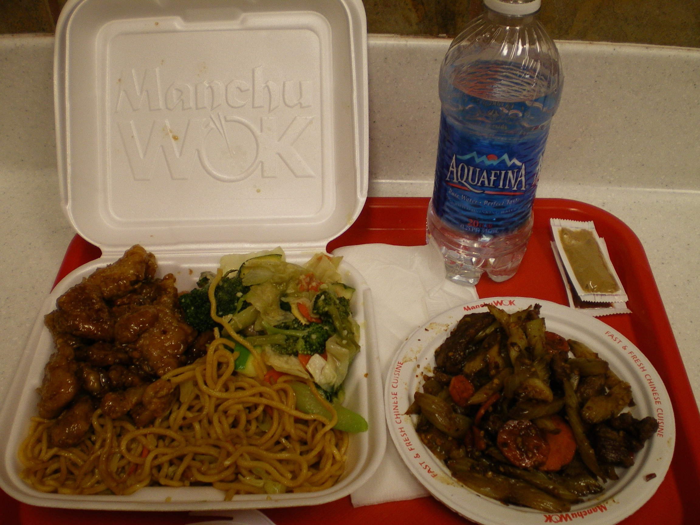 Manchu Wok の中華(?)ファーストフード。ヌードルと鶏のから揚げオレンジ風味、野菜炒め、牛肉と香味野菜。これで$8と少し。