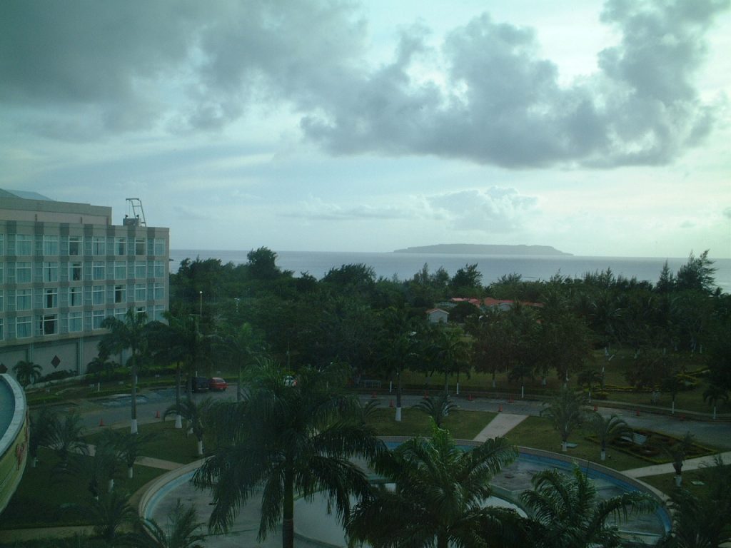 客室から見たヤギ島。この島は日本の信託統治領の時に、沖縄から移住した住民がヤギを放牧し、戦後野生化して大繁殖したことからヤギ島というそうです。ご存知のとおり、沖縄ではヤギ肉をよく食べます。