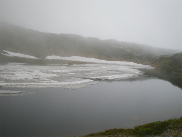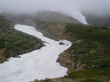 さて、ロープウェイを下りると、目の前は早くも雪渓である。あたりは濃い霧で、長袖がちょうどいいくらいの肌寒さである。姿見駅は標高1600mくらい、稜線にあがると1900から2000m位になるから、さらに寒くなる。大雨でずぶ濡れになり、さらに強風の吹きさらしに長時間いたというパーティーが、低体温症に陥ったのも無理はないのであった。