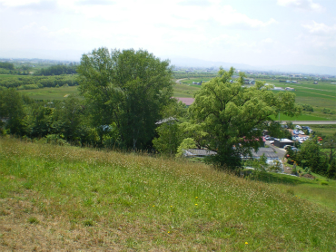 この射的山に登ると、北方向は広大な上川平野、南西には大雪山系の山々を望むことができる。麓には白樺とカラマツの大木に守られた、上野ファームの全景が広がる。周囲は水田や牧草地が広がる、何ともいえない広大な景色である。旭川は北海道のほぼ中心であるので、まさにそういう雰囲気である。