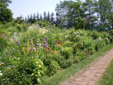 こちら上野ファームでは、ロングボーダー、サークルボーダー、ミラーボーダーなどと名付けられた花壇に、色とりどりの宿根草が咲いているのであった。7月というと北海道はいちばんいい季節で、白、赤、紫などいろいろな色の花がみごとでした。(奥さんだと花の種類とかくわしいのですが、私はバラくらいしか分かりません。不案内ですみません)