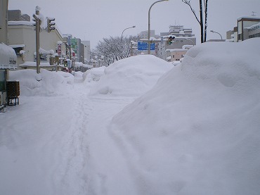 十和田湖に近い酸ヶ湯温泉で4mの積雪があり、青森県境に近い秋田県の玉川温泉では雪崩の被害があったように、先々週からの寒波で北日本は相当な影響を受けた。下の写真にあるように、青森市内でも歩道と車道の間に高い雪の壁が出来ていた(この中に本当の壁がある訳ではない)。