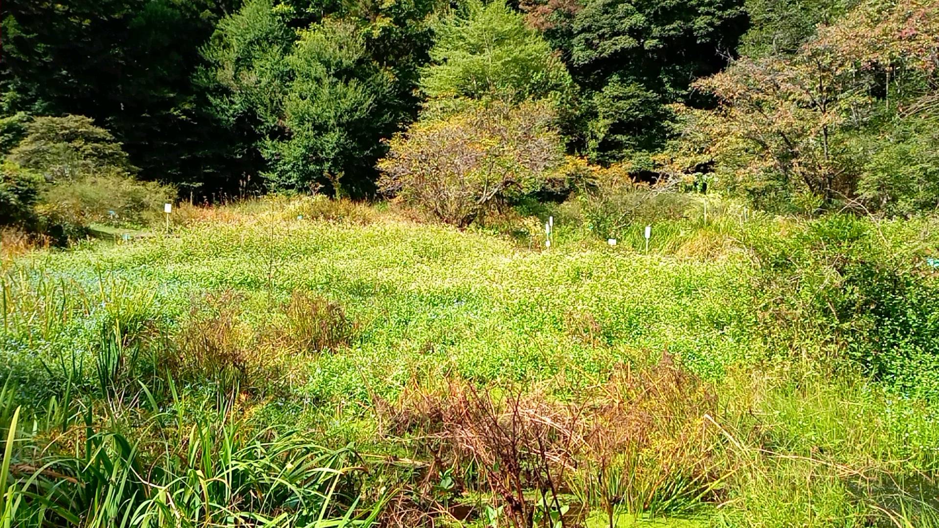春にはツツジやシロヤシオ、夏はミズバショウ、秋は紅葉が見頃になるはずである。オオモミジの大木をはじめ紅葉する木がたくさんあるのだが、今年は暑いのでまだ青々としていた。男体山に雪が降る頃ようやく紅葉かもしれない。