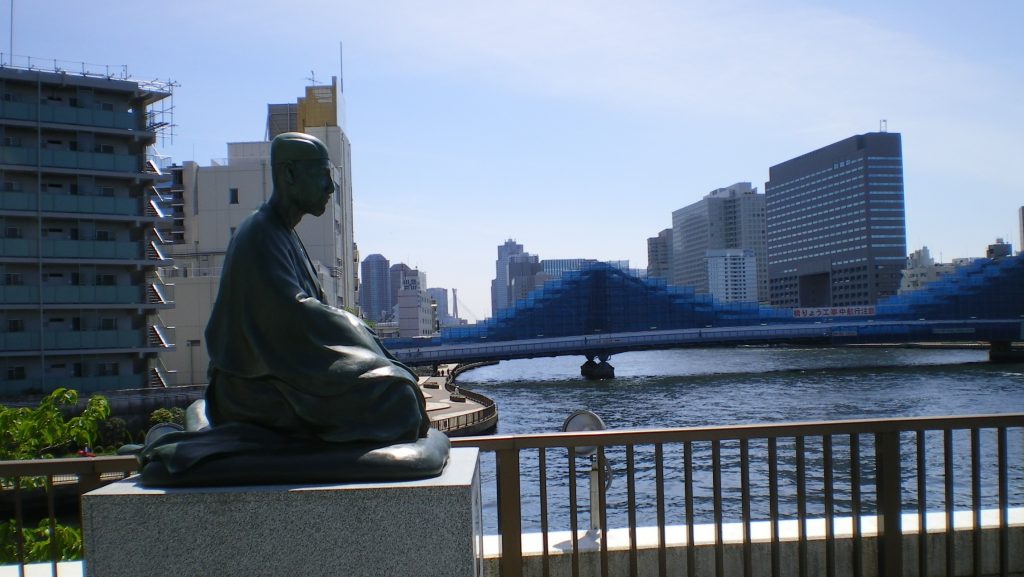 200mほど離れた分館の屋上には、隅田川を望んで構想を練る芭蕉の銅像が建つ。
