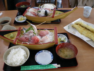 「かなや」のお刺身定食と大アナゴの天ぷら。おいしいです。