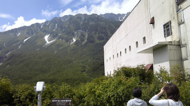 ロープウェイの上側、大観峰駅からは、いま登ってきた黒部ダムまでの景色がはるか下に望むことができる。ここは海抜2300m、黒部ダムは1450m。はるか下に見える。また向かい側にそびえている後立山連峰は、黒部ダム真上の赤沢岳が2670m、南に続く針ノ木岳が2820m。ほぼ目の高さである。
