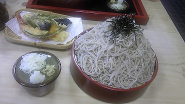 美術館前の蕎麦処・寿々喜(喜は七3つ)の大盛ざるそば。手打ちです。わさびはもちろん土地のものです。