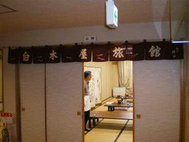 建て替えたばかりの白木屋旅館エントランス。古旅館という感じは全くなく、イメージと違って新しい。