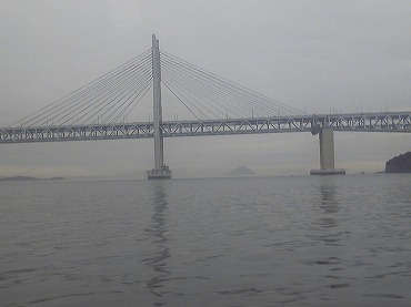 橋脚などの構造物が島をおおって見える岩黒島を間近に見て、櫃石島(ひついしじま)橋をくぐって高松側に出る。児島の突端、鷲羽山を大きく巻き、児島競艇場のすぐ沖合いを通る。競艇場内は写真撮影禁止だが、海の上からでは誰も文句を言わない。曇っている上にそろそろ日の入りで暗くなってきてはいるものの、絶景であることは間違いない。