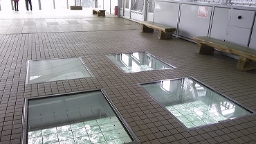 展望室の床面は、海が見えるようにガラス張りとなっている部分がある。近くのベンチに座って見ていると、潮の流れが非常によく分かる。