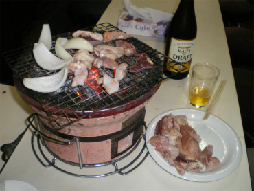 こんな感じで、七輪で塩モツを焼いて食べます。奥さん大感激!