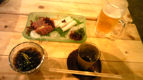 とりあえず生ビールの中をお願いする。「今日のイカ刺は、1ぱい1,500円になります」とさっそくのご案内。それで刺身盛合せ980円を注文する。「イカは入ってませんが」と言われてしまう。まあ、値段的に仕方がないだろう。盛合せには、イカではなくてタコ、サーモン、鮪、〆鯖、ハマチ、卵焼きが盛合せてある。