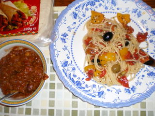 トマトとオリーブの冷製パスタ(右)とチリ(左)。ラベルが見えているのはトルティーヤ。パプリカはこんなに大きく切っても、全然気にならないくらいです。
