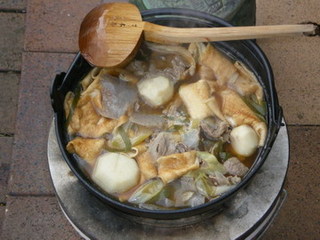 火を起こしてまず鉄鍋にお湯を沸かし、牛肉、長ネギ、こんにゃくと里芋を入れて煮る。里芋は下茹でしてぬめりをとっておくと仕上がりがきれいである。お湯のままで、里芋が柔らかくなるまで煮る。