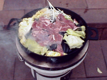 ラムは子羊の肉、羊の肉はマトンで、ラムの方が柔らかく羊独特のくさみが少ない。野菜は買い置きの春キャベツ、春タマネギ、それにもやしである。そして土曜の夜に吹いていた突風もぴたっと止んで、日曜日の午後は絶好の七輪日和となった。