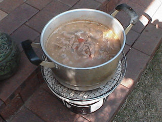 11月も下旬に近づくと日の落ちるのが早い。だからお昼を回ってすぐに火を起こさなくてはならない。大きめのずん胴鍋に水を張り、細かく切った鶏もも肉を水から煮始める。煮立ってくるとあくがでるので、適当にすくう。鶏なので、それほど神経質になる必要はない。いい鶏肉を使うと、何ともいえないおいしそうなにおいがしてくるから不思議である。