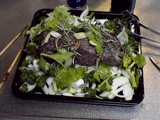肉は塩・こしょうをすりこんでたこ糸で形を整え、にんにく入りのサラダ油で表面をくまなく焼く。仕上げに赤ワインを振って火を入れ、炒めた肉を油ごと香味野菜を盛り合わせたオーブン皿に移す。香味野菜はタマネギ、セロリ、パセリ、にんにく、しょうが。そして焼いた肉の上に庭から取ってきた生のローズマリーを乗せて、170度のオーブンで50分。竹串で刺して肉汁の具合をみて、足りなそうだったのでさらに190度で10分。