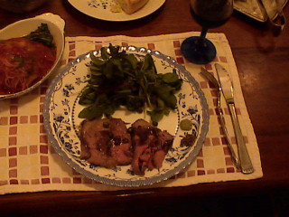 別に茹でたアスパラをトッピングすると、見た目鮮やかなのと味にアクセントがついていい。牛スネ肉のシチューに、パン、スパゲティと赤ワインでこの日の夕食となった。