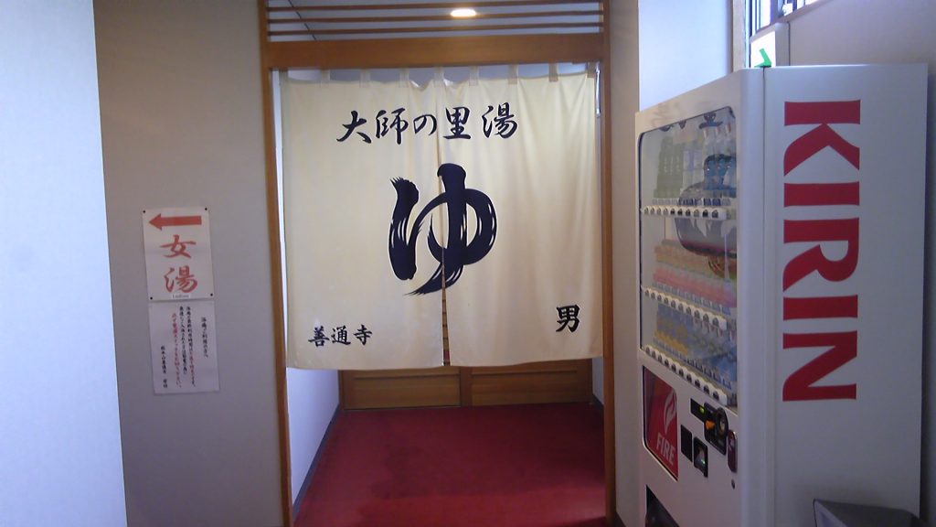 その浴室も収容人員に応じたたいへん立派なもので、「大師の里湯」と名付けられている。大師の・里湯なのか大師の里・湯なのか迷うところだが、細かいことを気にしても仕方がない。弘法大師が杖で突いたら温泉が出たという場所は全国いたるところにあるが、この温泉の湧出地も善通寺町三丁目だから善通寺の真下であり、もちろんお大師様由来なのだろう。
