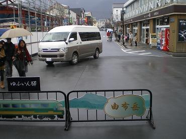JR湯布院駅前。この日は雨で由布岳は全然見えませんでした。