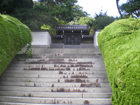 バス停6つか7つで赤間神宮前。バスを下りると、階段上に竜宮城を模したといわれる山門がそびえる。ただし、天皇陵は山門をくぐらずにその左手に進む。すぐに、WEBの写真でよく見る木の門が現れる。例の宮内庁の立て札が見当たらないなと思って探すと、石段を下りたバス停の高さにあった。天皇陵と赤間神宮は、そもそも入り口が違うのであった。