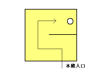 そして、真ん中の柱(これを心御柱~しんのみはしら、と呼ぶ)から右の柱にも板壁を置き、ご神体に拝謁する場合は入口から左・上・右と向きを変えてお参りする必要がある。だから、ご神体は正面からみると左側(西側)を向いていることになり、一生懸命拝んでも神様はそっぽを向いている形になるのである(お寺ではないので、実際に仏像がそちらを向いている訳ではない)。