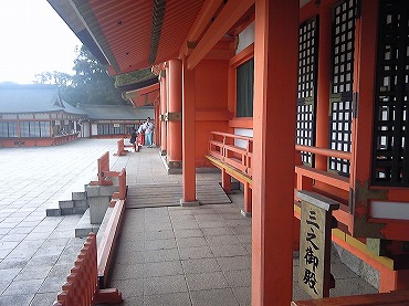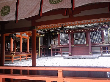横から見るとM字型をした屋根の「八幡造り」という独特の建築様式であるが、外側は回廊で囲まれているので、一般の参拝客では全体像を見ることはできない。一の御殿から三の御殿まで、それぞれにお賽銭を納めながら内部を覗いたけれど、ごくごく部分的にしか見えないのは残念であった。