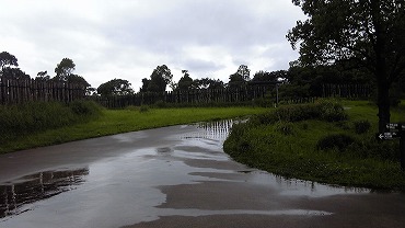 大雨の後の吉野ヶ里歴史公園。通路が川になっています。このあたりは雷の多いところで、毎日何回かは落雷があるそうで、この日も注意報発令で物見やぐらには登れませんでした。