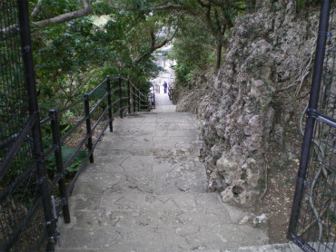 浦添ようどれには、復元工事中のグスク跡から外壁に沿って北側に下りて行く。