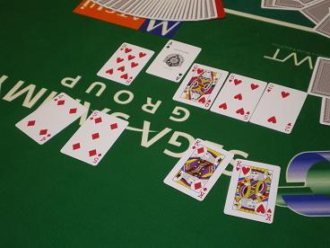 このアクションで、観戦していた方々にはプレミアム・ハンドがみえみえだったそうだが、OPPCの彼もそう考えたようで、長考。ただハンドが5d4dのスーテッド・コネクトだったので、最後はコール。AA、KK相手だとするとかえって勝率のある組み合わせであるし、次のSBでこれ以上のハンドが難しいと考えたのであろう。いよいよ、最終局面である。