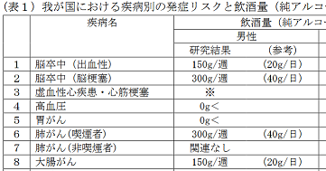 その内容をみてちょっと驚いたのだが、脳卒中、大腸がんなどの項目で発症リスクが高まるとされるアルコール摂取量は1日平均20gなのである。