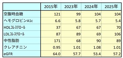 上表が気になる項目の推移である。糖尿病も高脂血症もまったく薬は飲んでいないが、昨年より悪くなっていない。LDLコレステロールはスタチンをやめたので上昇しているが、これで普通の水準である。昔はHDL40・LDL200という数字だったから、まあ人並みになったというところだろう。