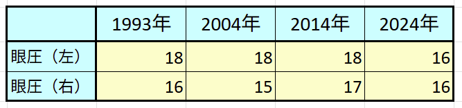 現時点で高くないとしても、傾向的に上がっているのかもしれない。過去の人間ドックの記録を調べてみた。その結果が下表である。30年間ほとんど変わっていない。どちらかというと下がっているように見える。そして、右目だけ差せと言われたのだが、高いのはむしろ左目なのだ。
