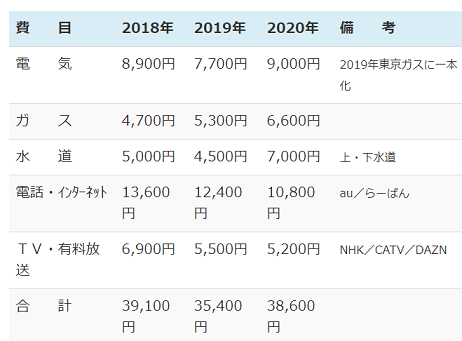 2021年の公共料金は、2019年より4,900円、2020年より1,700円増加しているけれど、月2万円のスポーツジム会費がなくなったので、生活費全体としては節約できている。