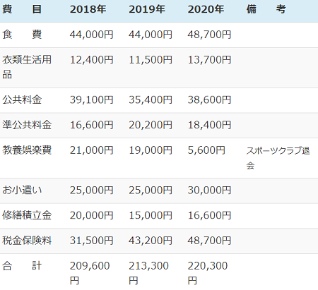 増えたのは衣類関係が5,300円(月平均なので、年間にすると約6万円)、お小遣いで10,000円(同12万円)、修繕積立3,400円(同約4万円)であり、これらは必要であるものの本当にきつければしないで済む支出であった。