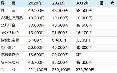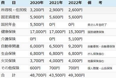 (準公共料金とは、私の家計管理上のジャンルで、銀行口座引落しでないけれど公共料金と似た性格の支出です。) 2022年の税・保険料 2022年の税金・保険料は下表のとおり。2021年より月約6千円上がったが、これはほとんど介護保険料の増加によるものである。 2022年の生活費 さて、他の支出も含めた2022年の生活費は下表のとおり。月平均23万6千円余りで、収入の20万円を大きく上回っている。しかも、昨年までできていた修繕積立もできていない(どころか、使い込んでいる)。 LINK