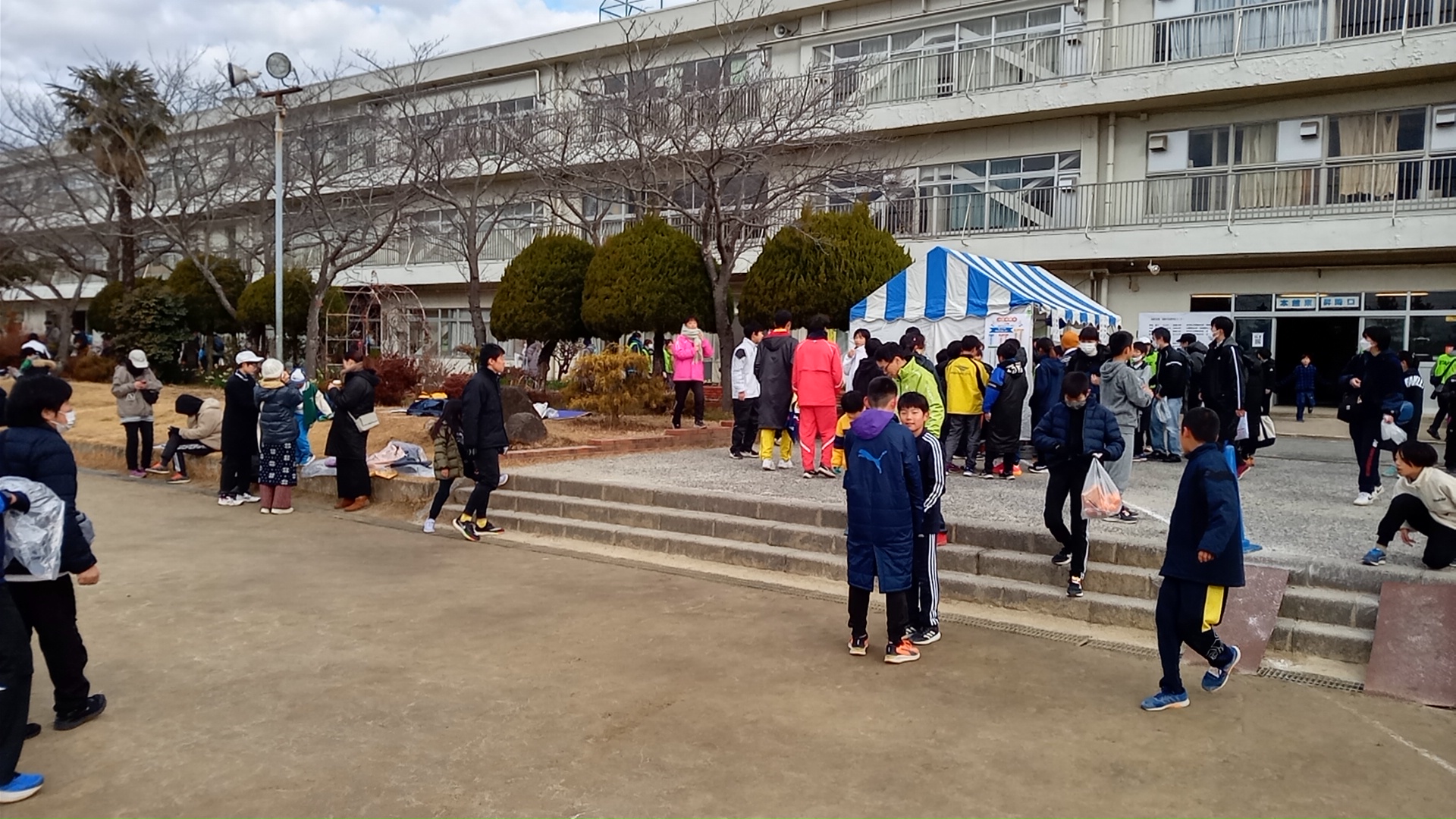 体育館で着替えた後、小中学生のレースを見ながら歩いて駐車場に戻る。5km走った後の3km歩きは予想外にきつく、40分の予定が50分かかってしまった。レースが終わって歩いていると、突風が吹いてきた。